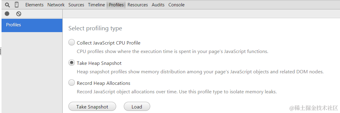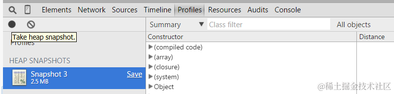以调试mode执行代码到line 16,点击icon “Take heap snapshot.”生成第二个snapshot: