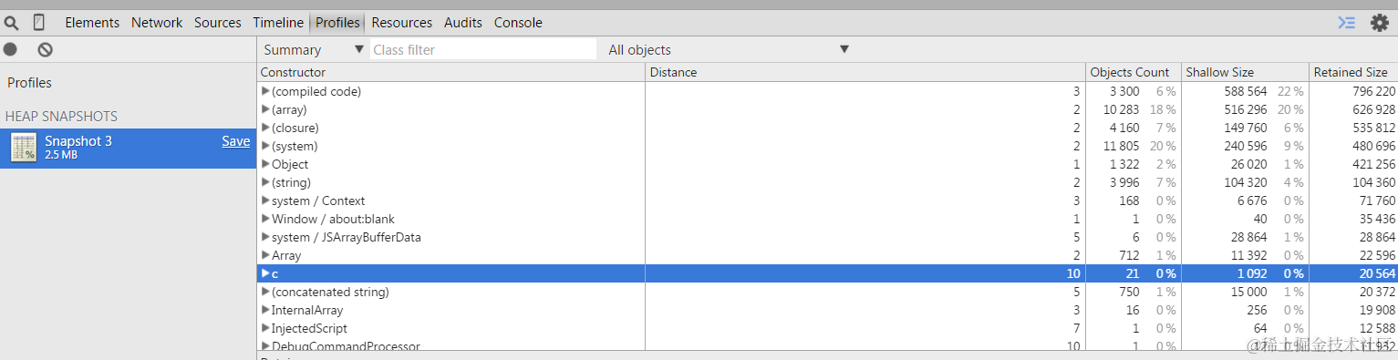 在Summary里用变量名array 做filter, 即可找出在snapshot3 和snapshot4之间内存占用最高的变量arra: