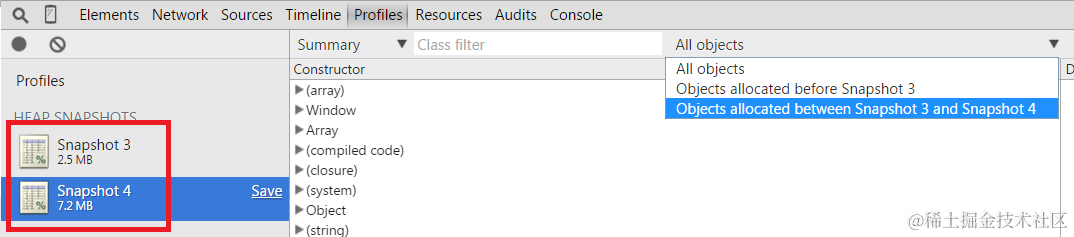 从dropdown list里选择"Objects allocated between Snapshot 3 and Snapshot 4":