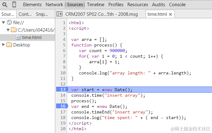 在测试代码line 13和line 16处设断点. 以debug方式运行,首先断点在line13 处触发: