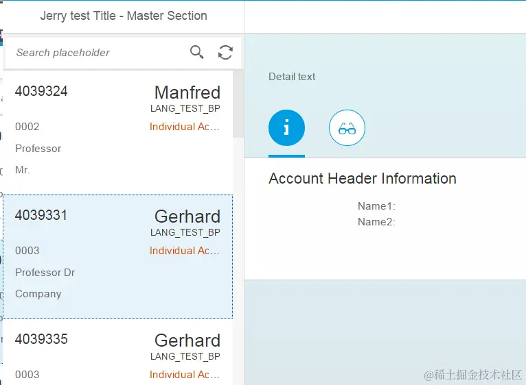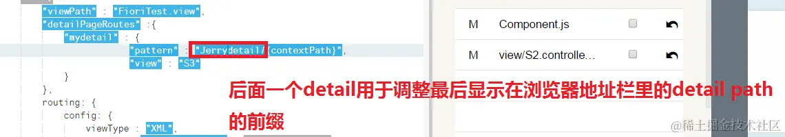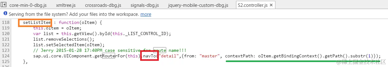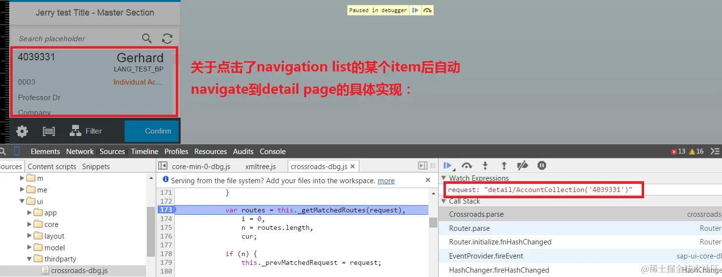 answer:在我们自己的application view里传递的。当我们点击navigation list时,框架自动调用我们注册的事件处理函数setListItem, 在line 124将当前待显示的detail page的上下文,所谓的contextPath,即 "detail/AccountCollection('4039331')"通过调用route框架的方法navTo传入route框架