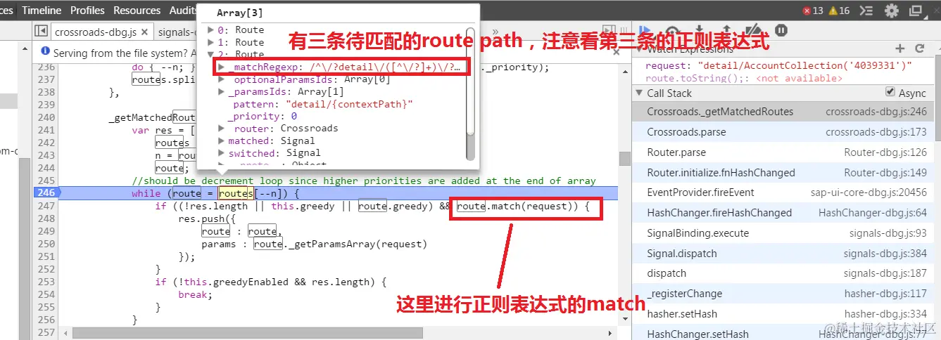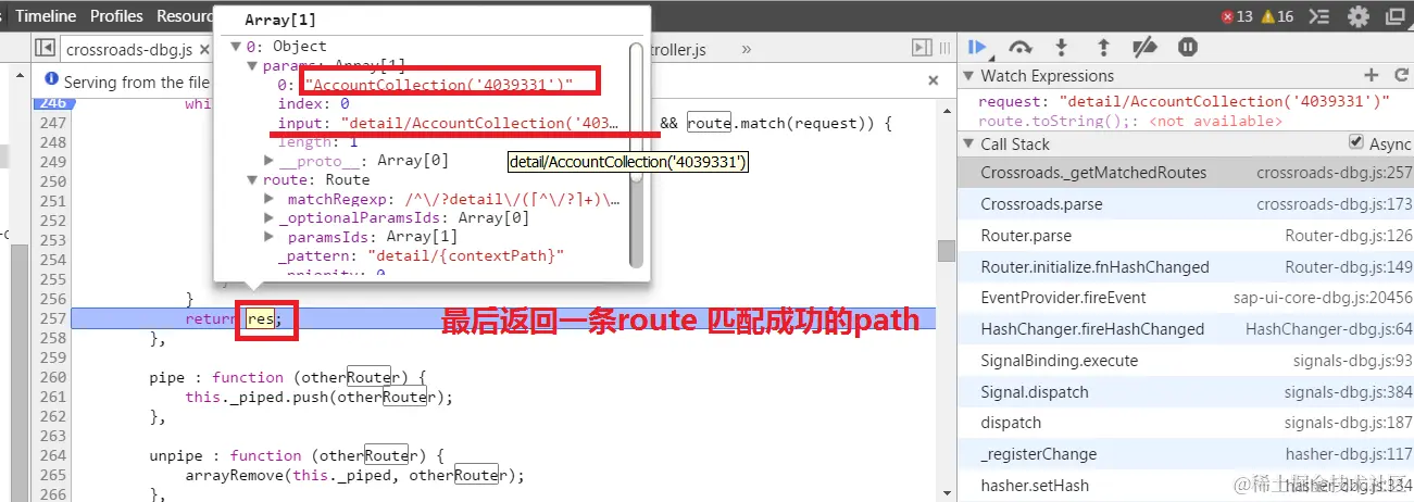 如上图所示,router framework试图根据传入的route request "detail/AccountCollection('4039331')" 来获取一条匹配的route path.