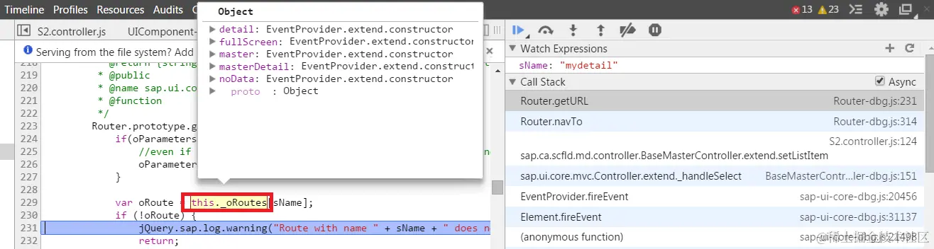 原因是this._oRoutes object里没有名为mydetail的attribute:
