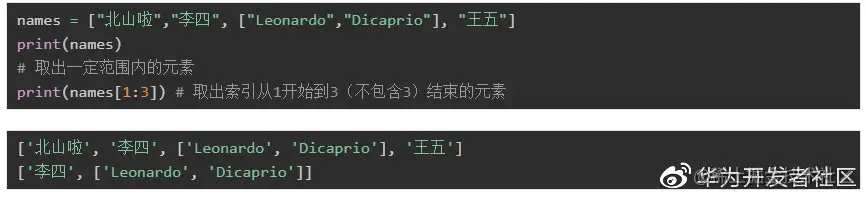 如果要从列表中取出一定范围内的元素,则可以使用list[start:end]的方式来获取,例如:names[1:3]取出从索引1开始到索引3结束(不包含索引3)的2个元素。