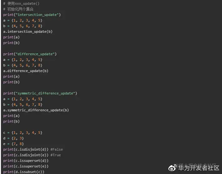 symmetric_difference_update()/ intersection_update()/ difference_update()/update():还是进行前面的对应交、并、差、对称差操作,但将运算的结果,更新到这个集合。