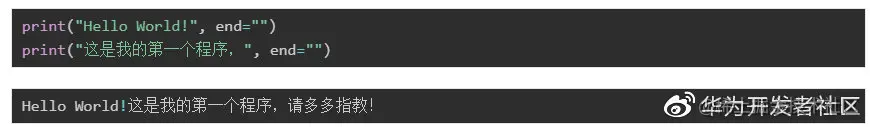 可以看到,每条print()语句,都会占一行。如果想将上面的三句话输出到同一行,可以这样: