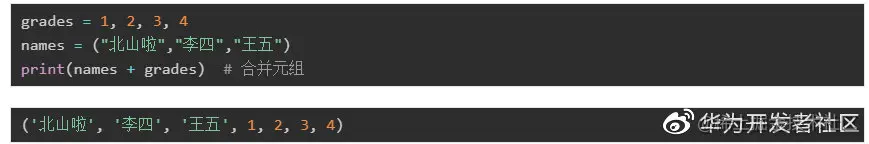 列表和列表之间、元组和元组之间,可以使用“+”将两个列表或者元组中的数据合并成新的列表或者元组