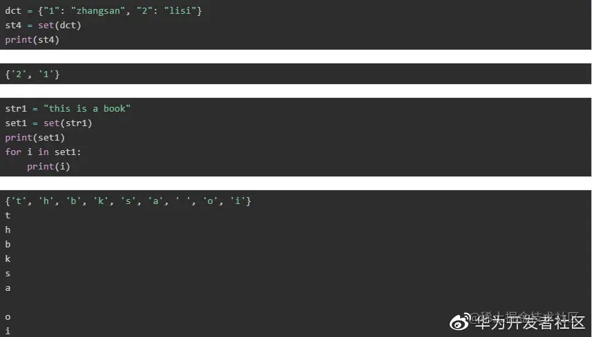 - 如果创建空集合,不可以使用{},因为系统会首先将其当做字典数据类型来处理。所以空集合请使用set()来创建