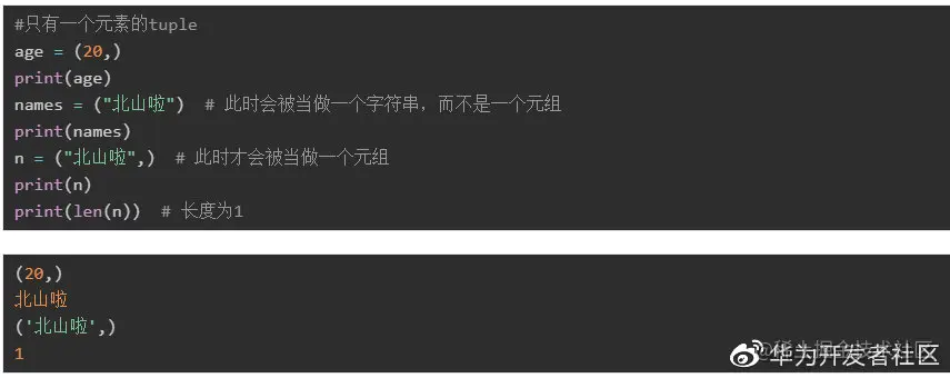 元组还有一个需要特别注意的地方是只有一个元素的元组数据的定义。因为()还是表达式中使用的符号(用来改变操作符顺序),因此如果只有一个元素,定义成 names = (“北山啦”),此时()会被当做表达式符号,这里就会被忽略掉,因此names的值此时为字符串”北山啦”,而不是元组类型。为避免这种情况,可以这样定义单个元素的元组数据:names = (“北山啦”,)