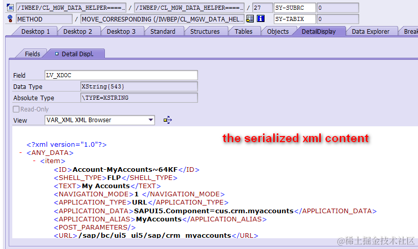 SAP Netweaver gateway framework序列化 已注销 2021-04-25 73 阅读1分钟 Created by Jerry Wang, last modified on Sep 09, 2015 serialization serial deserialization 输入是一个internal table, 内容为myAccount的 navigation target 信息: 输出是一个xml string: 要获取更多Jerry的原创文章,请关注公众号"汪子熙":
