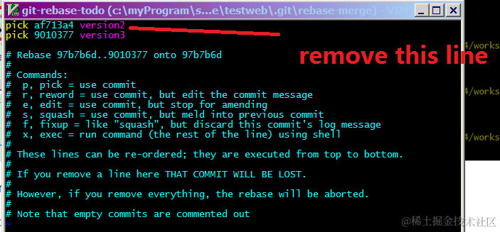 Use git rebase --onto <target commit version, in my example it is the top commit fa47da9 > <the commit version you would like to remove, in this example it is af713a4 > HEAD:
