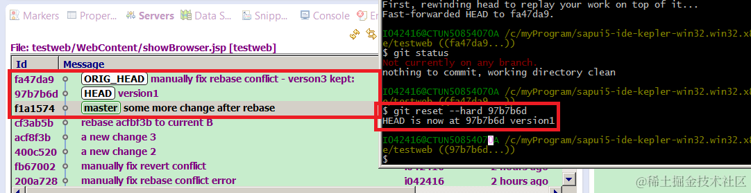 After successful execution, use an arbitrary git reset command to trigger the refresh, and now you will find that the wrong commit history af713a4 is removed also from Eclipse History view: