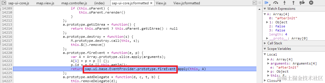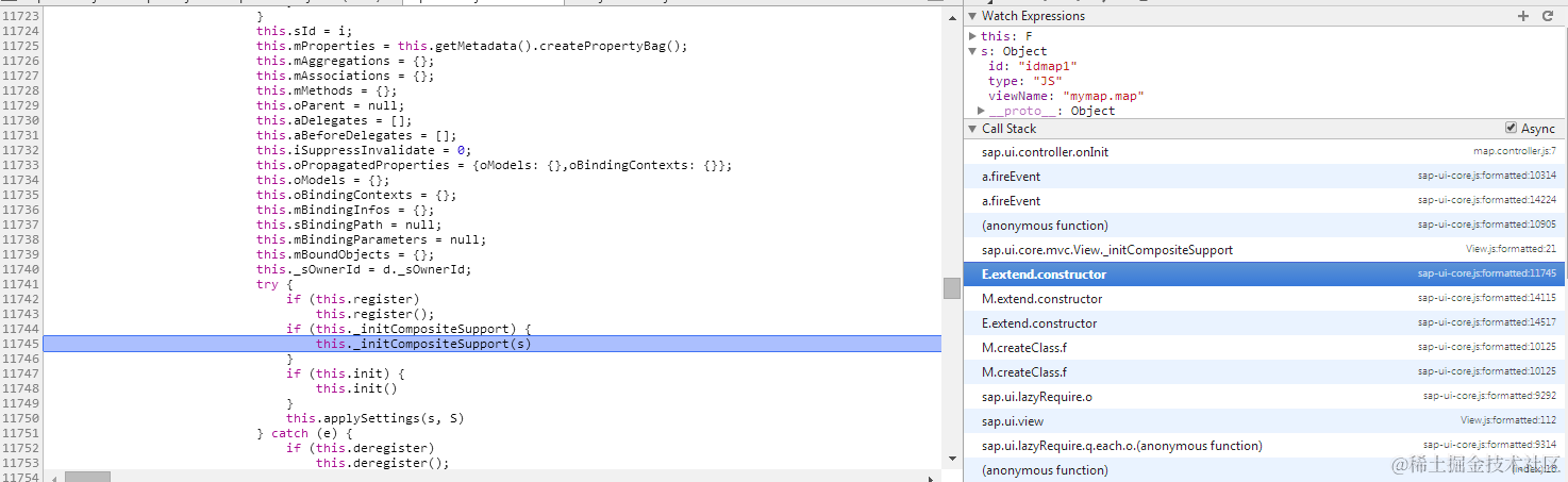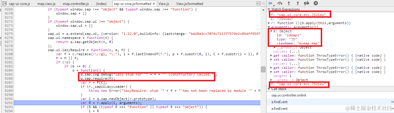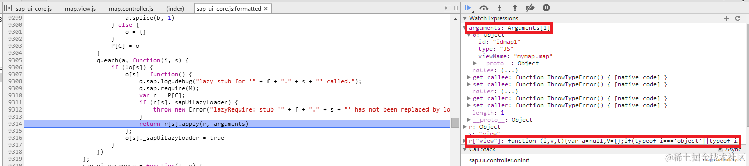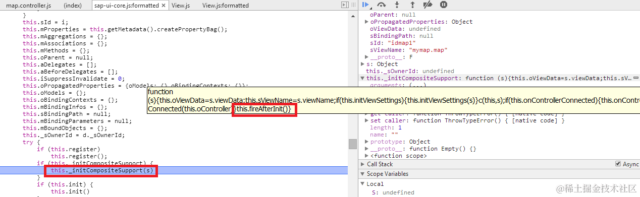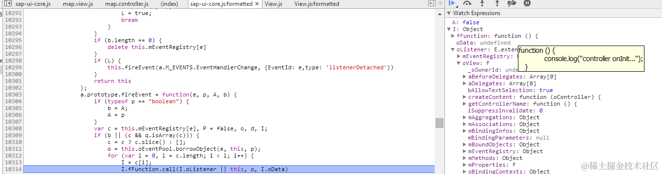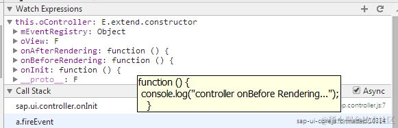 Callstack8: I.fFunction就是controller里实现的onInit方法,oListener就是controller,oListener.oView就是view本身。