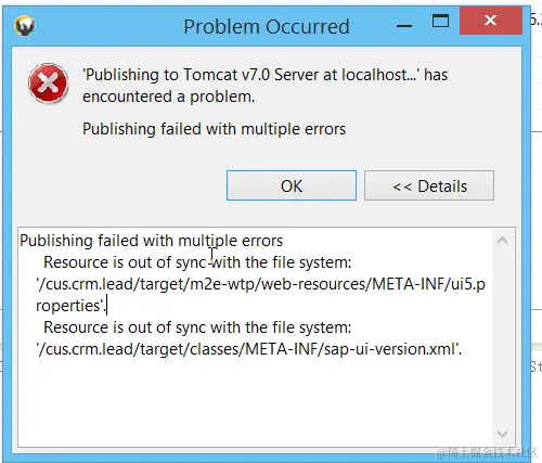 Resource is out of sync with the file system: ‘/cus.crm.lead/target/classes/META-INF/sap-ui-version.xml’.