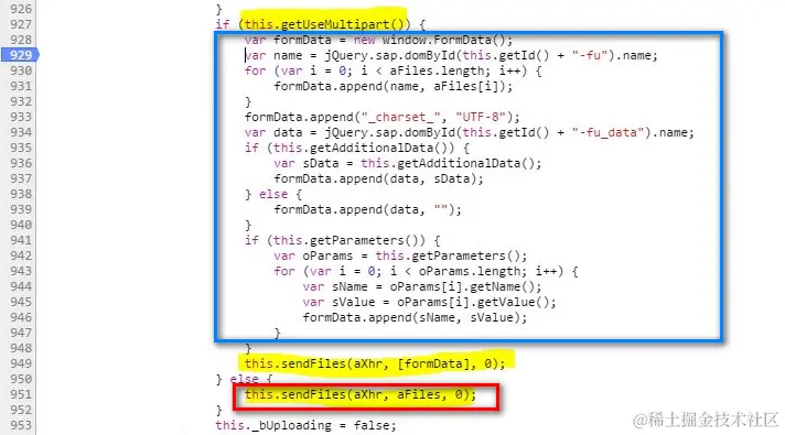 1.28.5 FileUploader.sendFiles() 从黄色的地方继续向下执行,直到成功上传。 这两个部分的逻辑是不一样的。