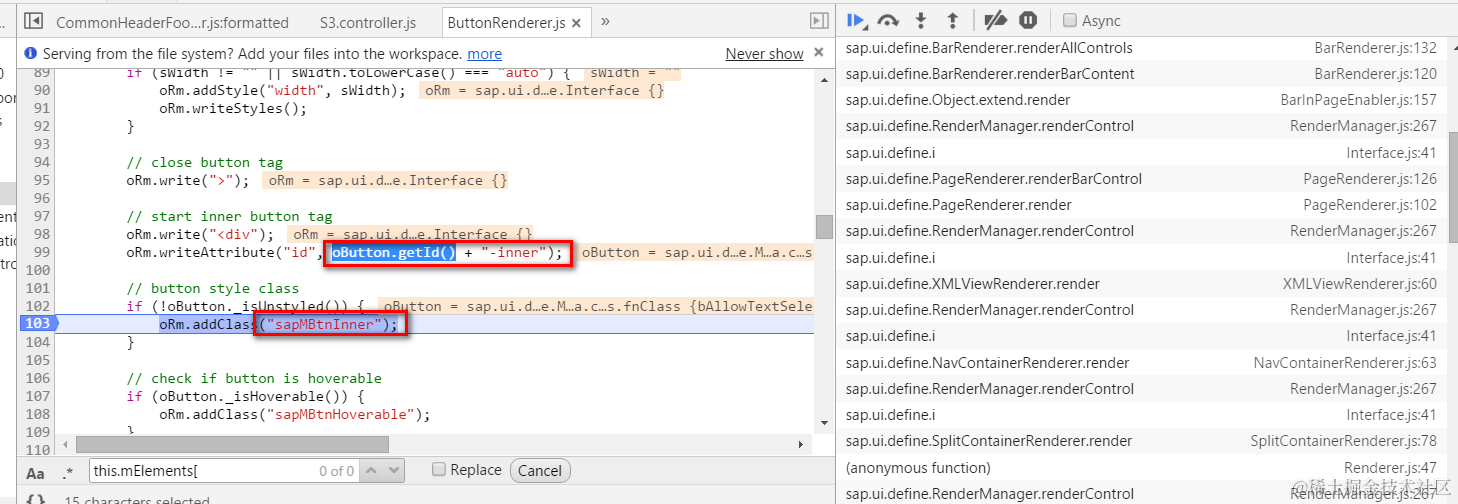 Opportunity的s3在init的时候有加载custom css的文件 ```javascript jQuery.sap.includeStyleSheet(jQuery.sap.getModulePath("cus.crm.opportunity.css.Opportunity", ".css"), "sap-ui-theme-sap.crm"); ``` 我往这个css文件里面加一个自定义的css class ```css .myAwesomeBtnBackgroundColor { background-color: red; } ``` 之后就找出Target button然后将这个custom css class加载上去…
