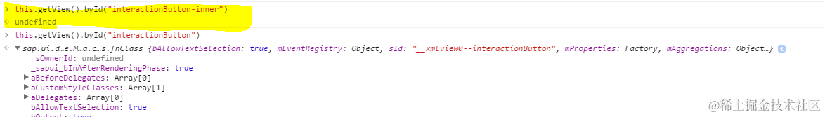 Ui5 control object – 通过上图line 307行生成。每个control object在core的this.mElements里拥有一行对应的entry。使用byId时,传入的id必须是ui5 control object的id,不能是native html tag的id。 -