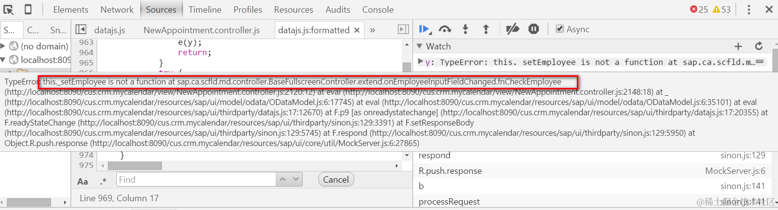 然后我就在chrome的里debug,发现其实浏览器是有跑图2的红底色代码的,但OPA frame里确实是没有可视的suggestionItems的。我尝试用写waitFor()方法去找suggestionItem所定义的类型(sap.ui.core.Item)的控件,也还是找不到,从而input的suggestionItemSelected事件也就无法继续写opa test case去测。