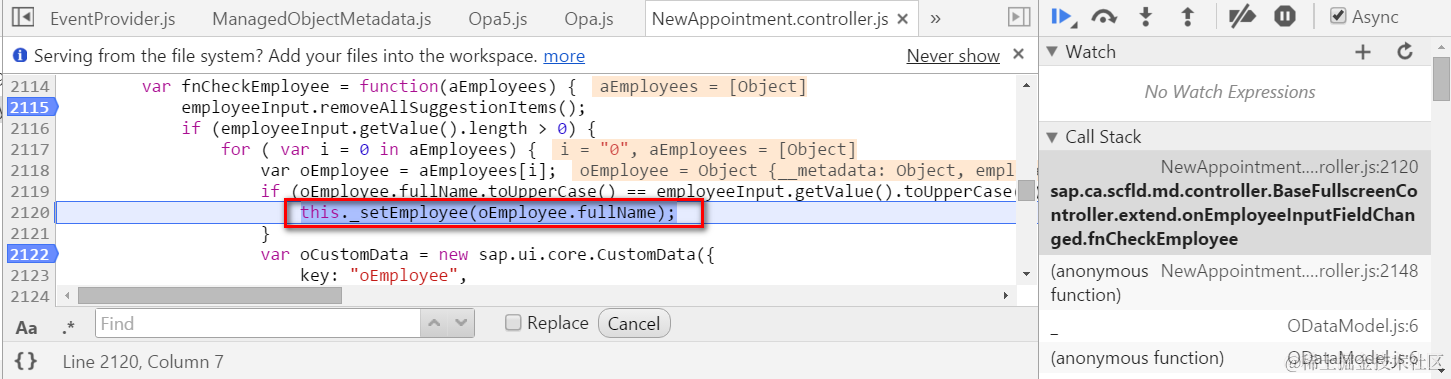 在OPA里通过waitFor()方法找到了#responsibleText控件,并触发了它的LiveChange事件,去调用NewAppointment.controllers.js中的onEmployeeInputFieldChanged方法。但是很奇怪的是,Jekins的report显示,onEmployeeInputFieldChanged方法中,带红底色部分的代码并没有运行(见图2),从而没有为#responsibleText 这个input生成suggestionItems。OPA运行结果如图3.