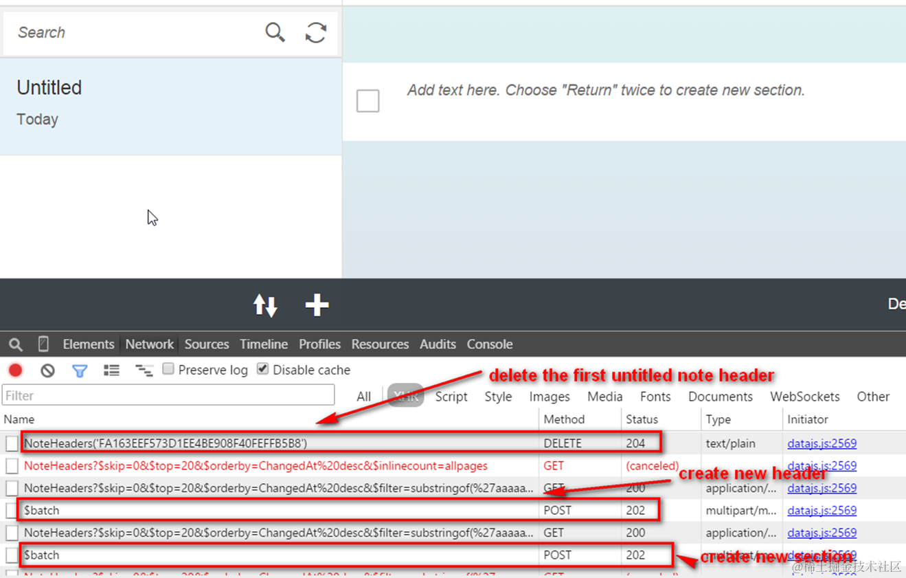 b. the dummy note header, note A, is deleted by Odata request ( HTTP method DELETE)