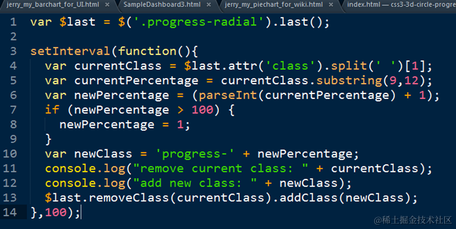 - index.js里以100毫秒为时间间隔定期执行一个匿名函数. 在这个函数里,动态设置当前progress circle的class。