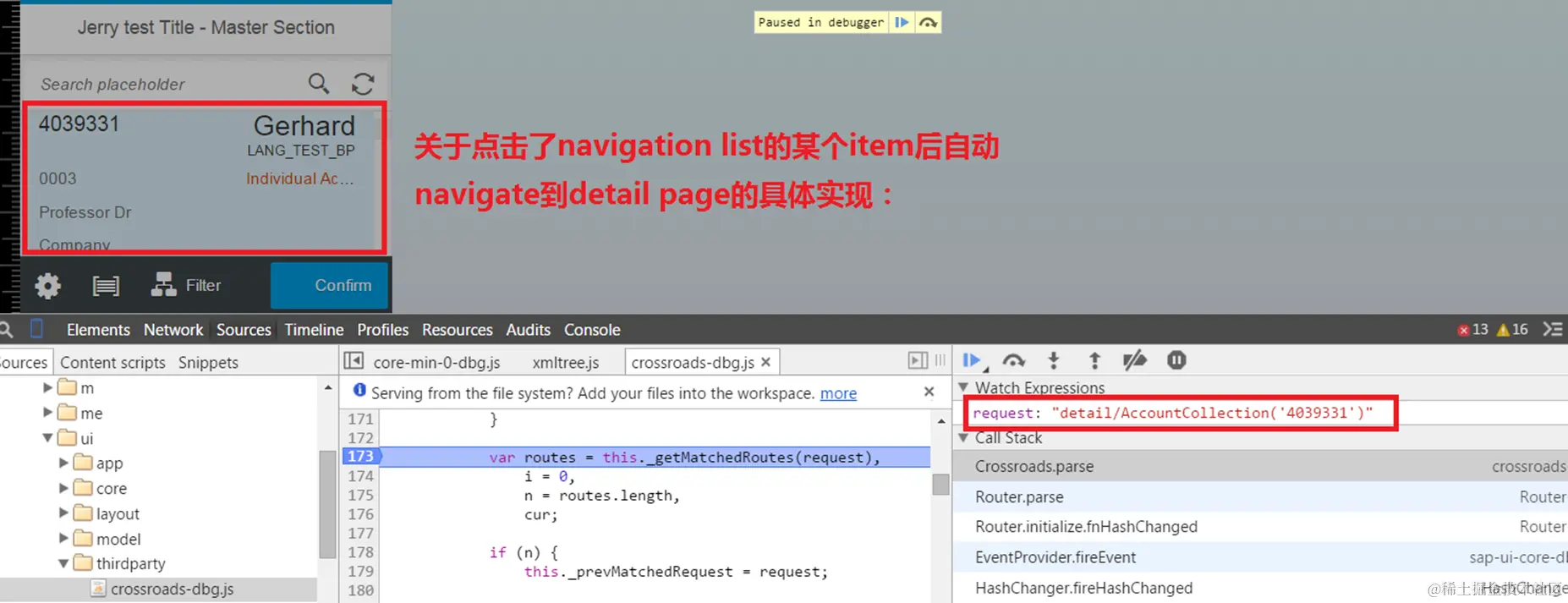 answer:在我们自己的application view里传递的。当我们点击navigation list时,框架自动调用我们注册的事件处理函数setListItem, 在line 124将当前待显示的detail page的上下文,所谓的contextPath,即"detail/AccountCollection(‘4039331’)"通过调用route框架的方法navTo传入route框架