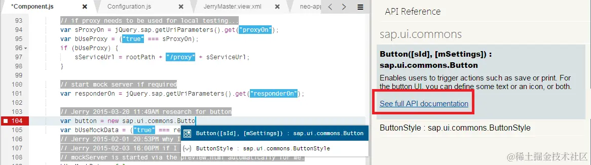 Suppose you would like to know how to use button control, you could explore the built-in api reference functionality provided by WebIDE via clicking “ctrl+space”: