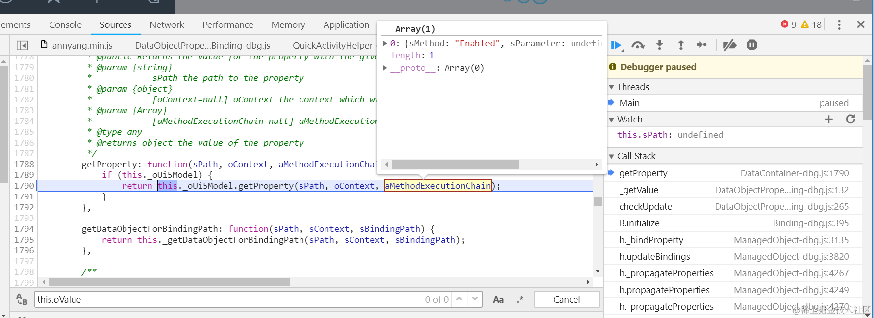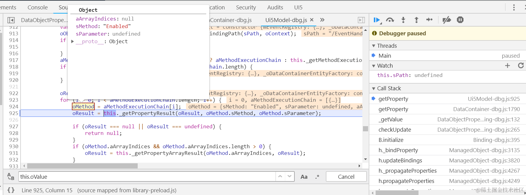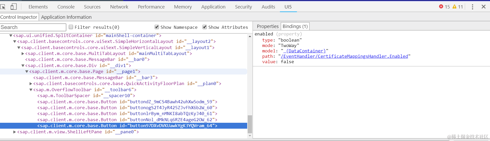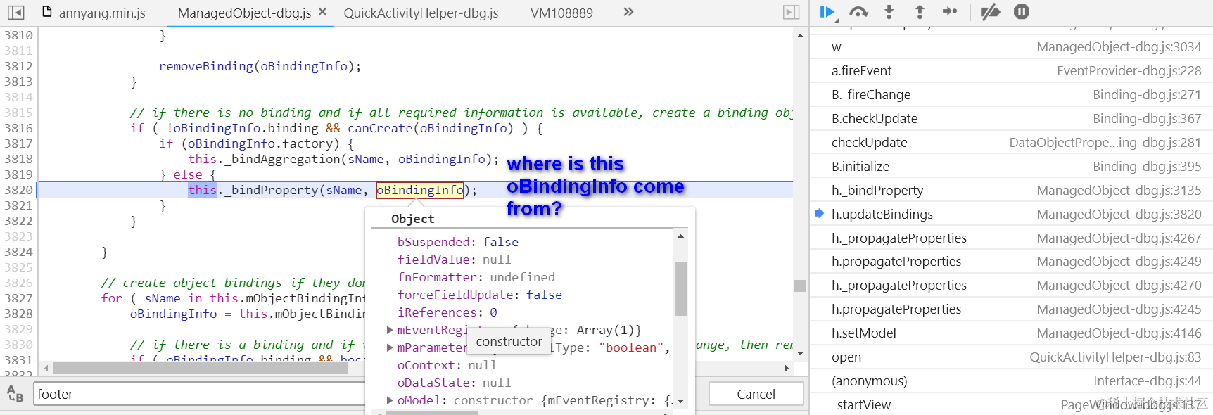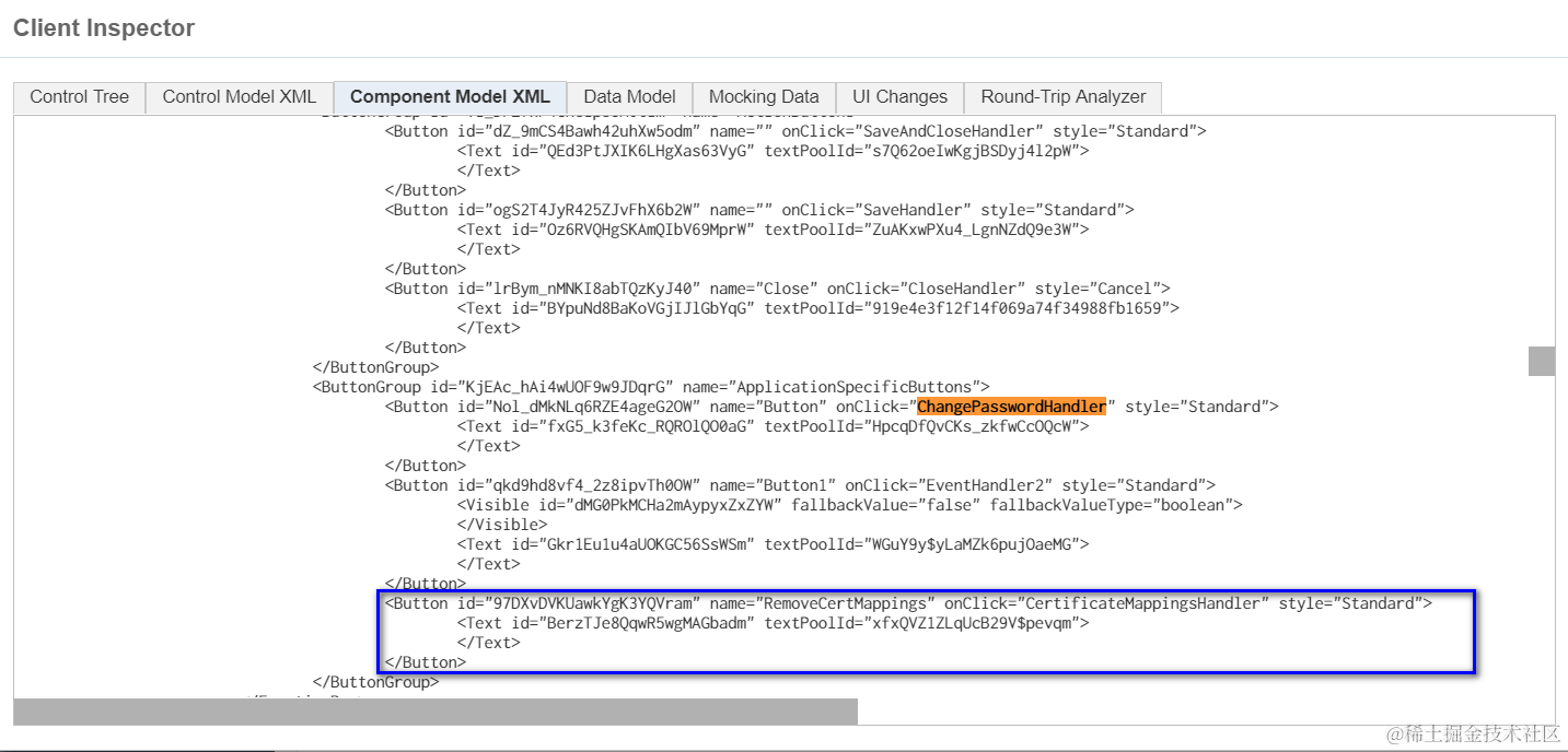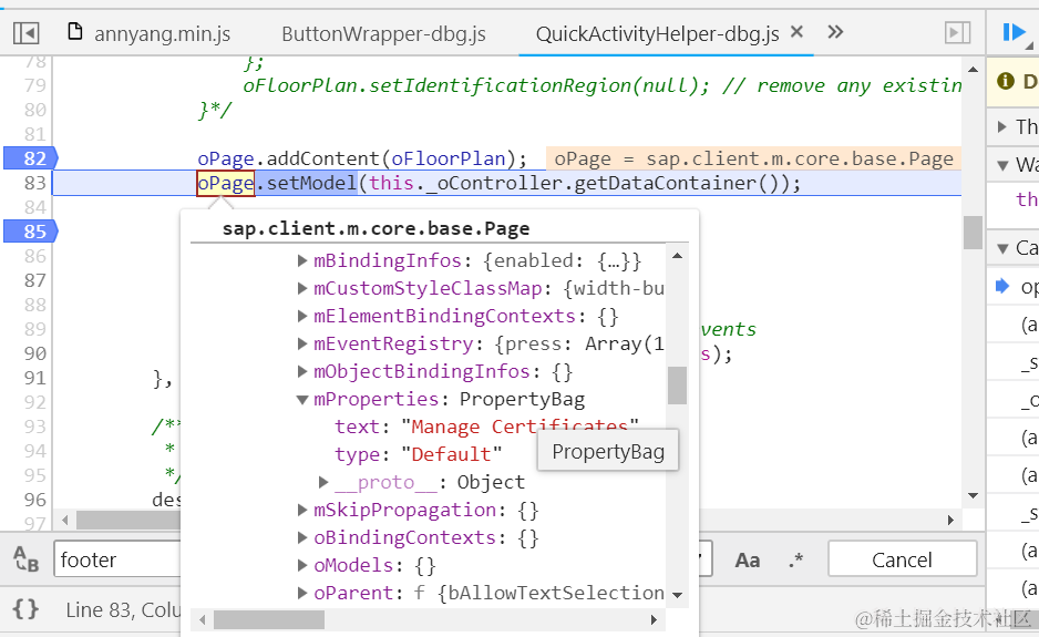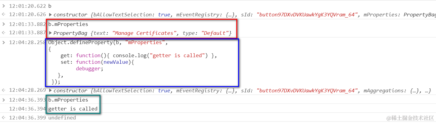 Object.defineProperty(button, “mProperties”, { get: function(){ debugger;}});
