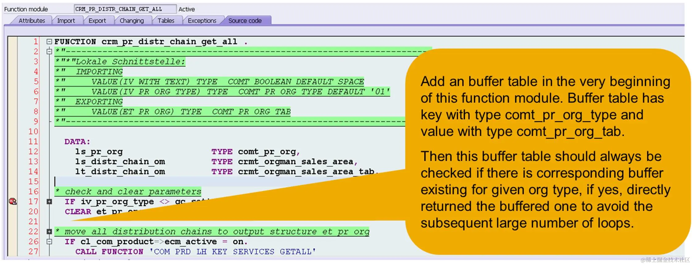 Since the FM will directly go to database table to retrieve the org description without buffer logic, so for customer use case, the DB table is queried again and again. For example we have 10000 materials and customer currently have 10000 sales org in their system, so totally CRM_PR_DISTR_CHAIN_DESCR_GET will be called 10000 * 10000 = 100 million times! This does not make sense. If we simply add the buffer logic inside the FM CRM_PR_DISTR_CHAIN_GET_ALL, we can reduce the number of DB call from 100 million times to only 1 time.