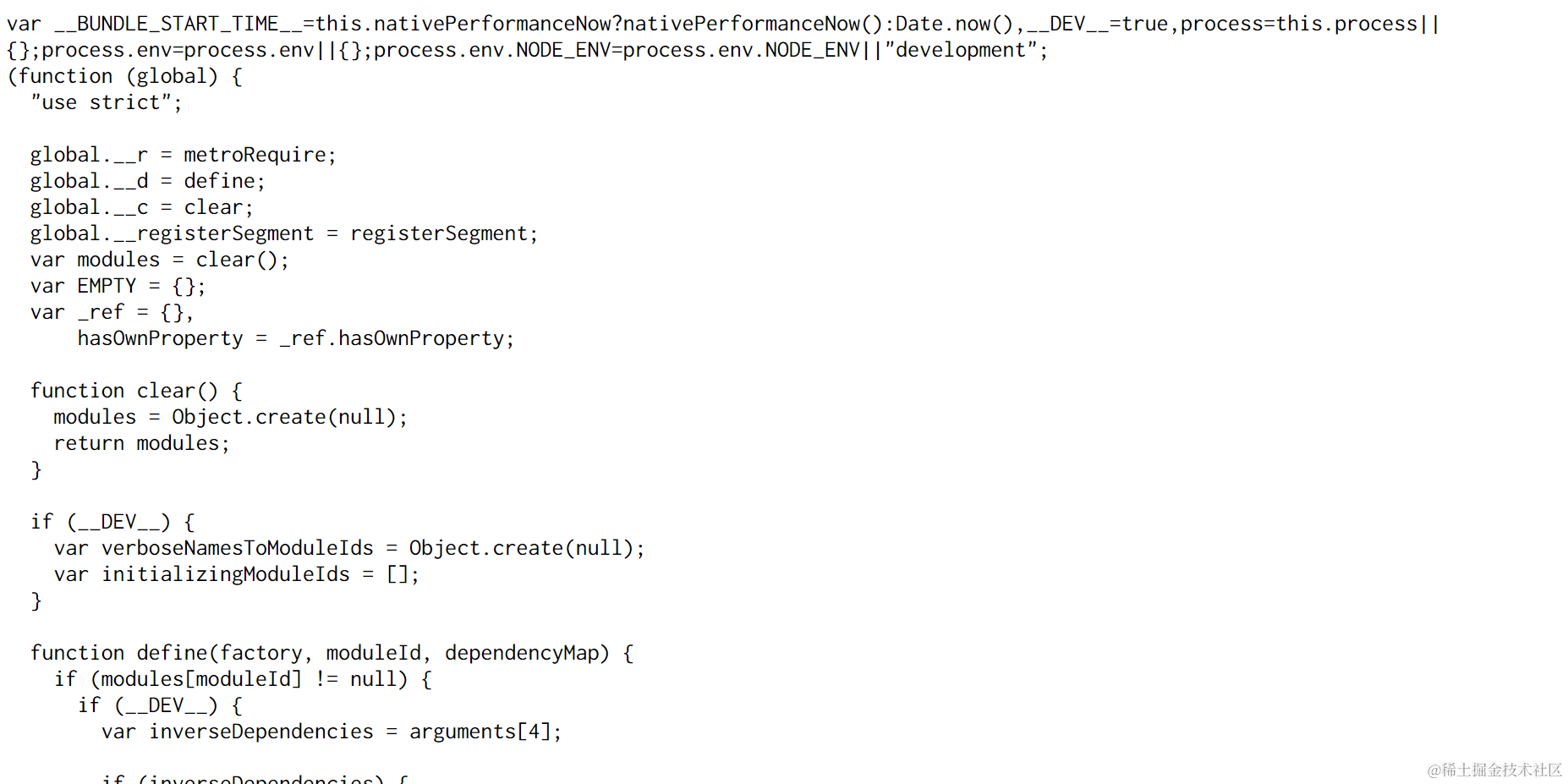 react-native在windows环境下的项目启动 已注销 2021-04-25 110 阅读1分钟 访问链接:http://localhost:8081/index.bundle?platform=android 应该在浏览器里看到如下的打包脚本: 要获取更多Jerry的原创文章,请关注公众号"汪子熙":