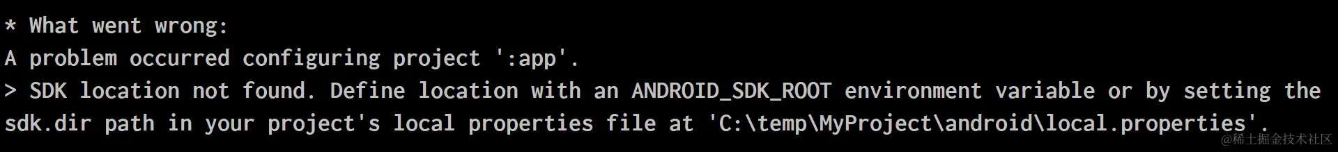 SDK location not found. Define location with an ANDROID_SDK_ROOT environment variable or by setting thesdk.dir path in your project’s local properties file at 'c:\temp\MyProject\android\local.properties