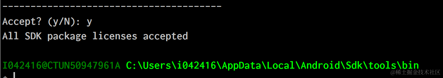 如何使用sdkmanager命令行接受SDK package的license 已注销 2021-04-25 79 阅读1分钟 到SDK安装目录的tools\bin文件夹下,执行sdkmanager.bat批处理文件,参数–license: 选择yes即可: 看到All SDK package licenses accepted的提示,说明ok了: 要获取更多Jerry的原创文章,请关注公众号"汪子熙":