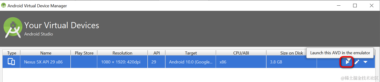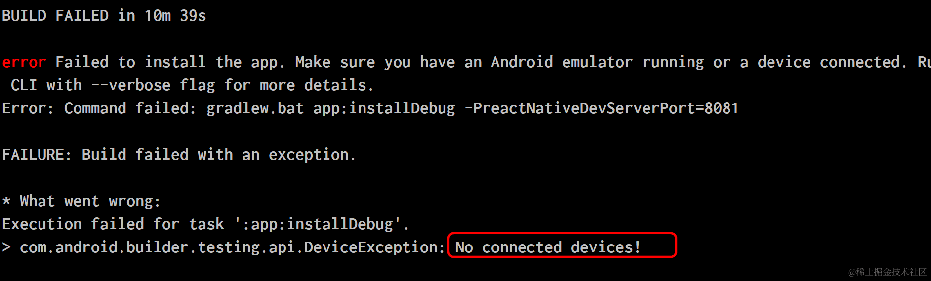 windows环境里React-Native运行失败的原因之一,安卓模拟器未启动 已注销 2021-04-25 55 阅读1分钟 错误消息:com.android.builder.testing.api.DeviceException: No connected devices! 解决方案: Tool->AVD manager: 启动一个新的模拟器 之后重新运行命令react-native run-android: 一切运行正常: 要获取更多Jerry的原创文章,请关注公众号"汪子熙":