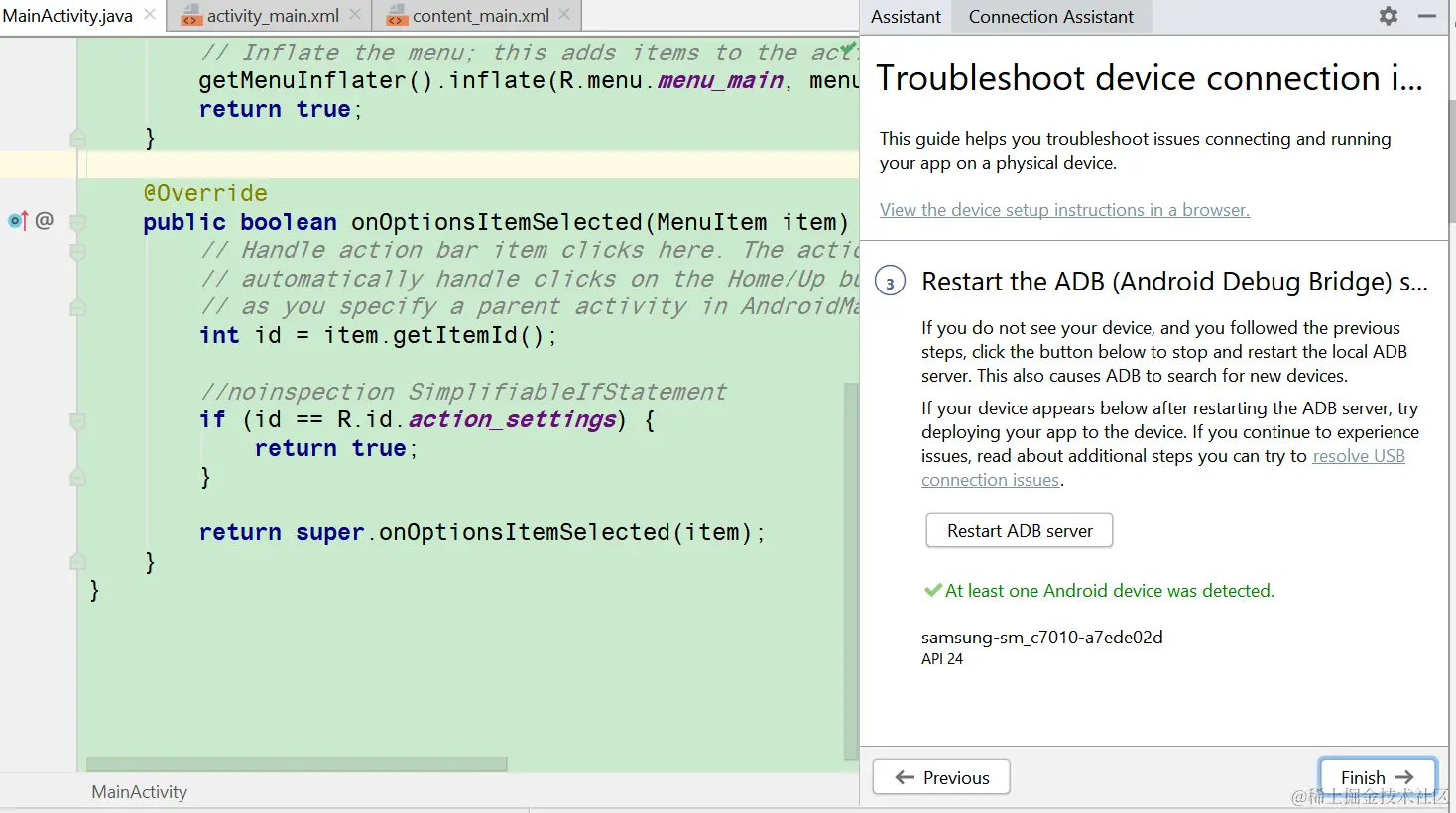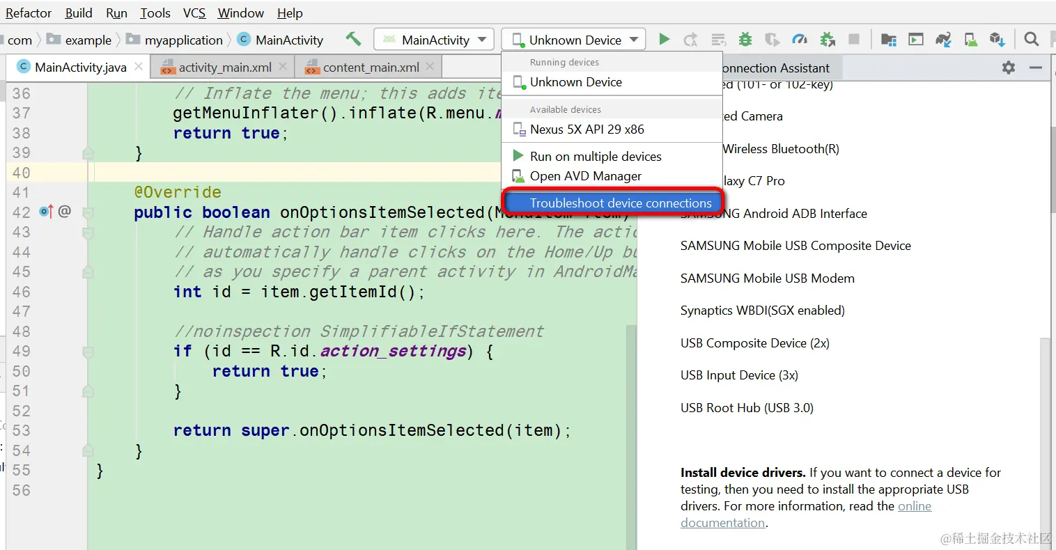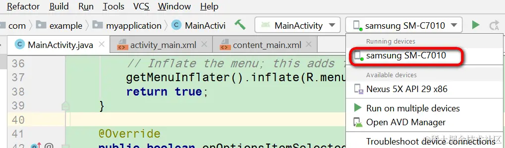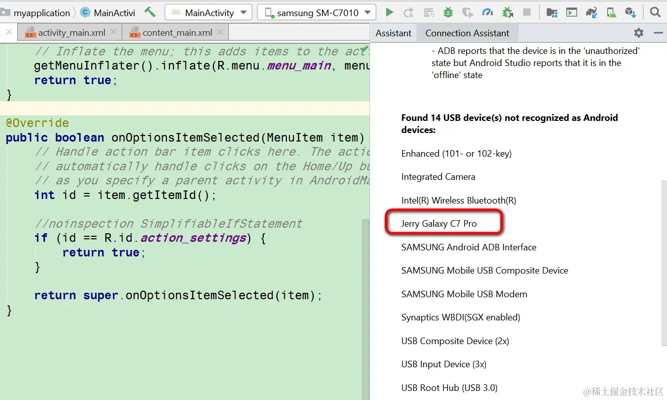 Android studio如何连接三星手机 已注销 2021-04-25 709 阅读1分钟 打开Android studio,选择Trouble Shoot device connections: 这个菜单项会自动扫描本地已经用USB线连接的设备: 已经成功扫描出了我的Galaxy C7 Pro手机: Restart ADB server: 成功识别出来了: 手机上选择Yes: 现在Android studio里运行一个Activity,顺利安装到我的三星手机上了: 要获取更多Jerry的原创文章,请关注公众号"汪子熙":