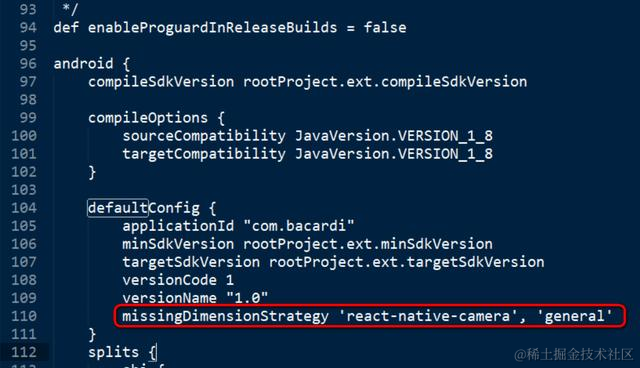 需要在应用的android/app/build.gradle文件里添加一行配置:missingDimensionStrategy ‘react-native-camera’, ‘general’