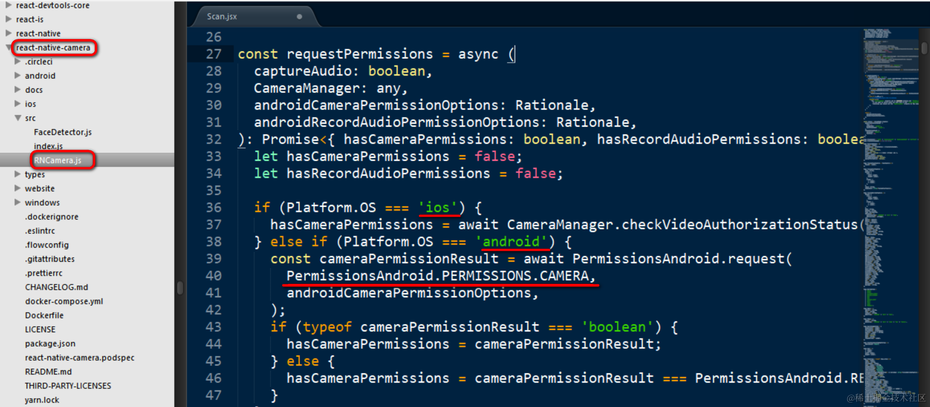 到React-Native应用文件夹node_modules下查看RNCamera的实现,发现果然是根据移动操作系统的类型分别作了处理。如果是Android平台,使用摄像头对应的权限为:PermissionsAndroid.PERMISSIONS.CAMERA