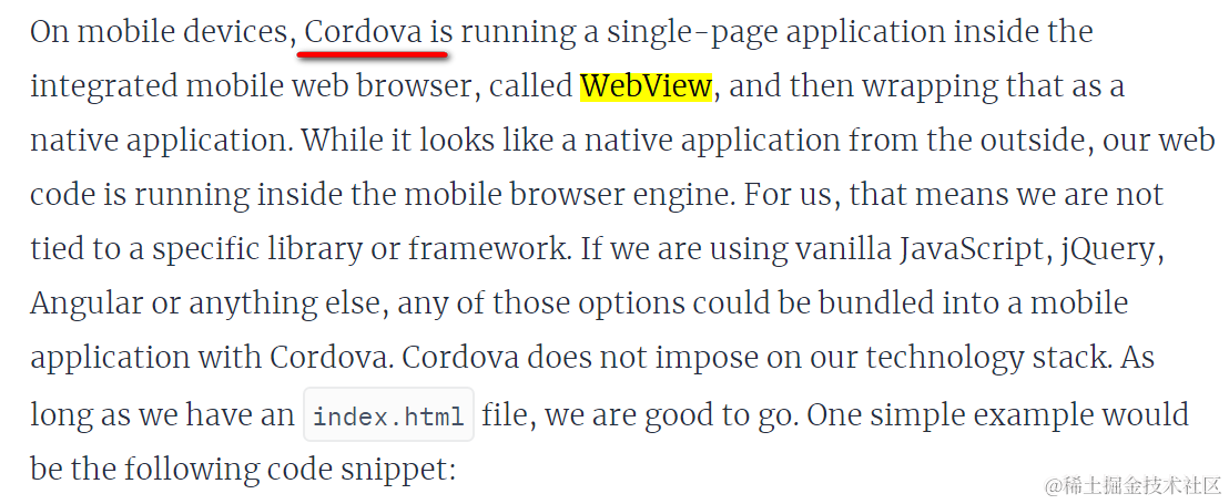 去年Jerry的C4C开发团队同事,Yang Joey曾经写过一篇文章:SAP移动应用解决方案之一:HTML5应用 + Cordova = 平台相关的混合应用,介绍了SAP Cloud for Customer的移动端应用是怎么基于开源项目Cordova创建的,当时文章曾经提及,使用Cordova打包成的移动应用,实际上运行在移动平台的WebView里。而React-Native则有着和Cordova完全不同的设计理念。