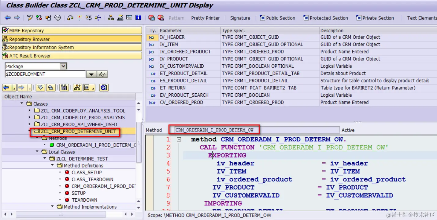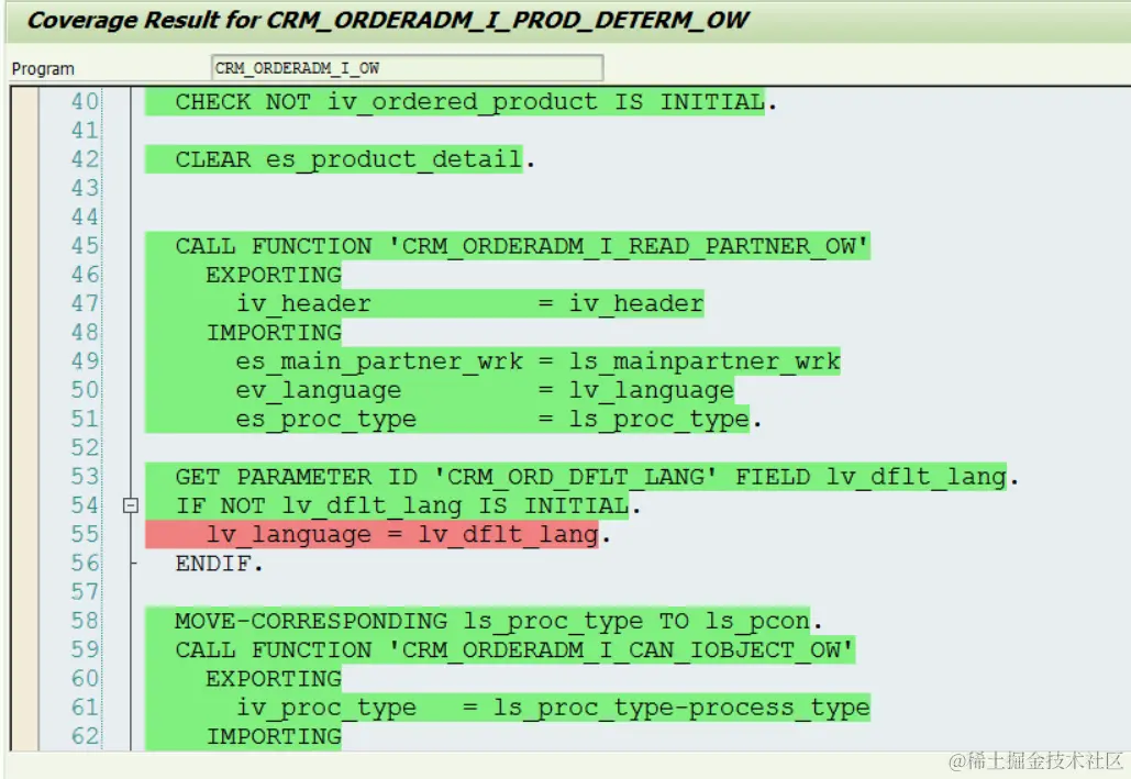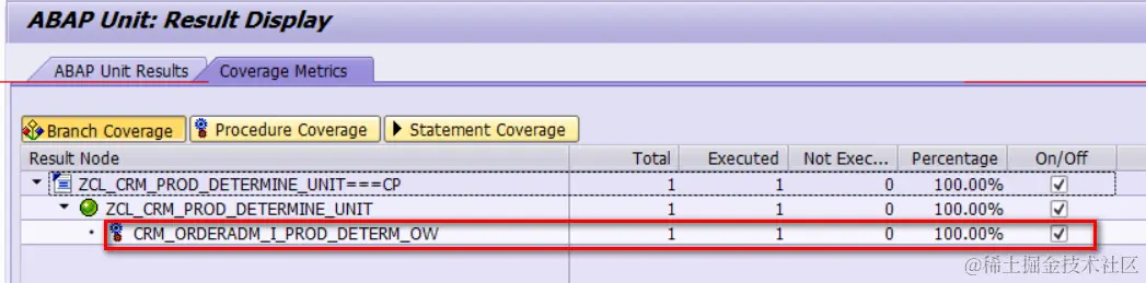 In test coverage report for CRM_ORDERADM_I_PROD_DETERM_OW, the line with red color means the code is not executed during this unit test.