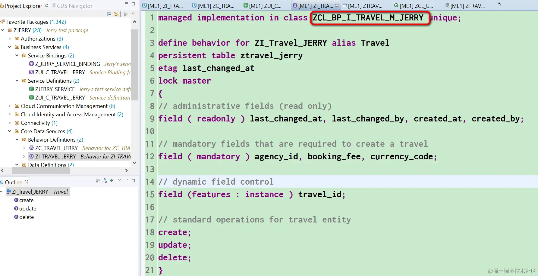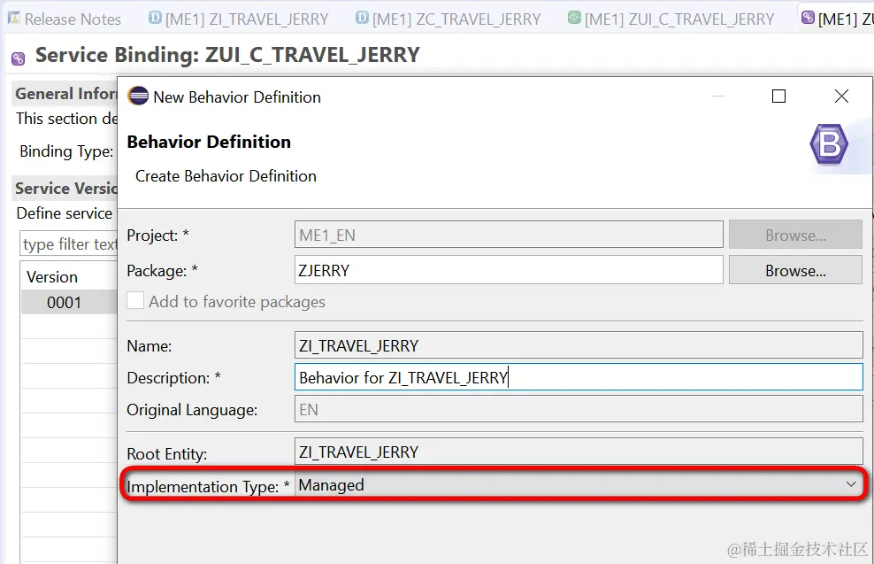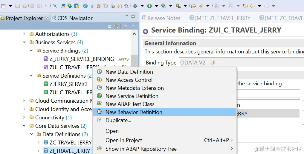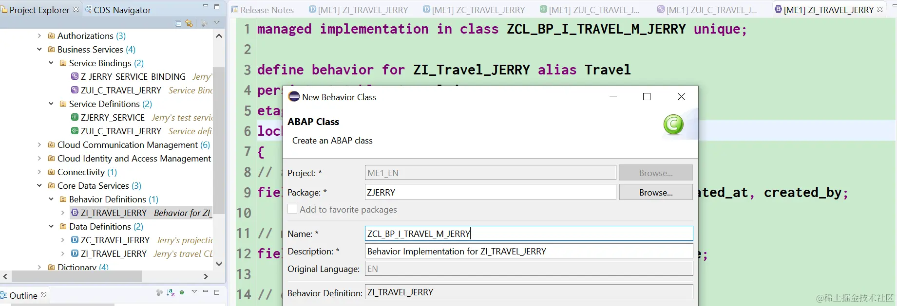 当然增删改查的功能光定义不行,还得创建其对应的实现。上图Definition中已经指定了实现这些行为的ABAP类名称为ZCL_BP_I_TRAVEL_M_JERRY. 为此,右键选择New Behavior Implementation: