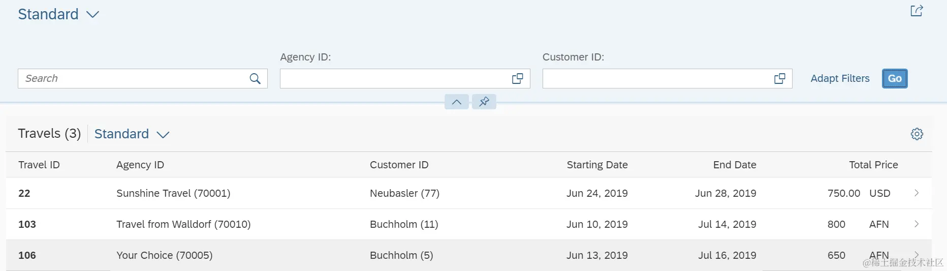 双击后会自动打开一个链接,一个Fiori应用就呈现在我们眼前了。我们没有进行一行的JavaScript web编程,就得到了一个专业的支持高级搜索的Fiori应用,能查看底层数据库表ZTRAVEL_JERRY的内容。