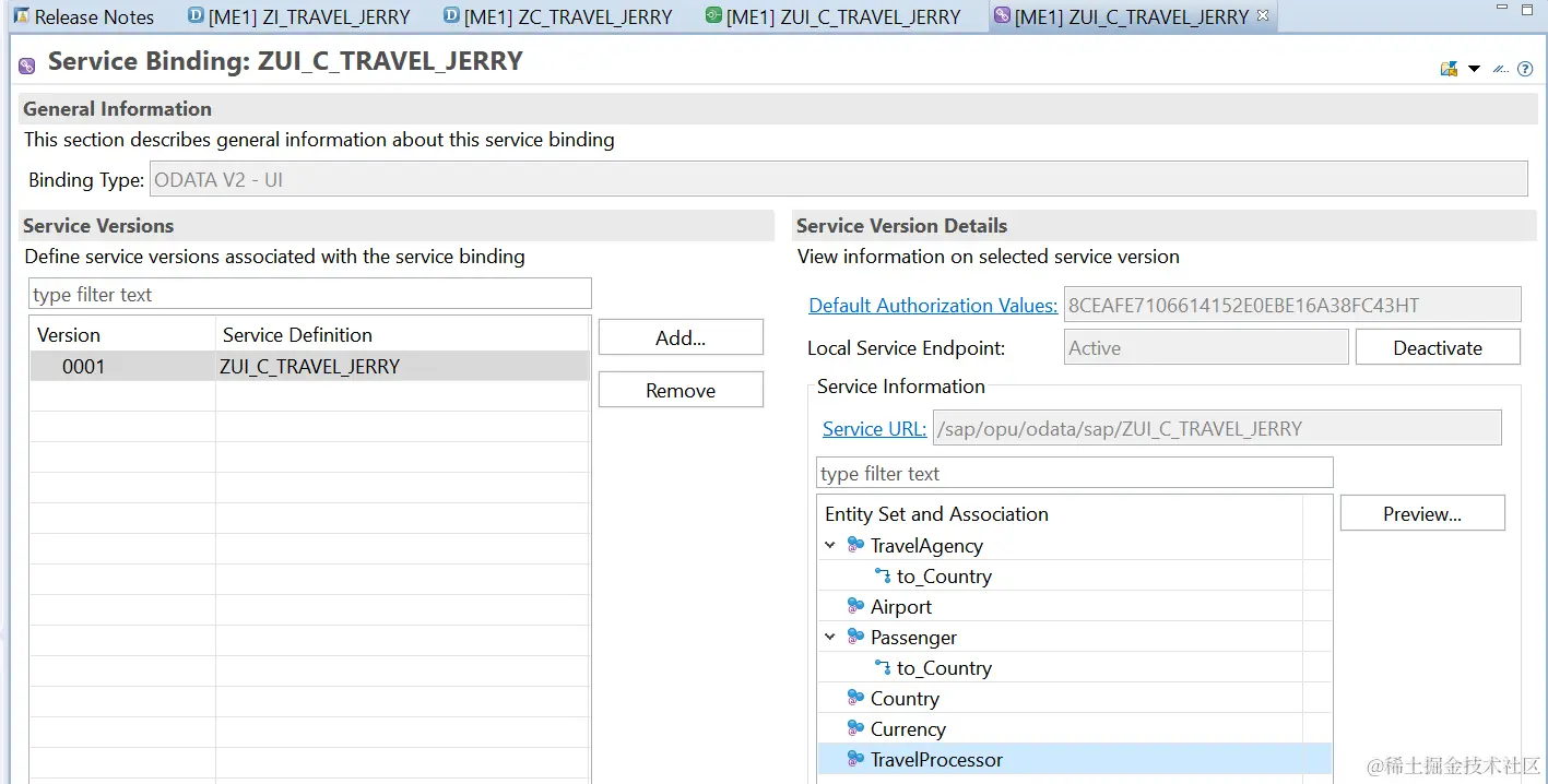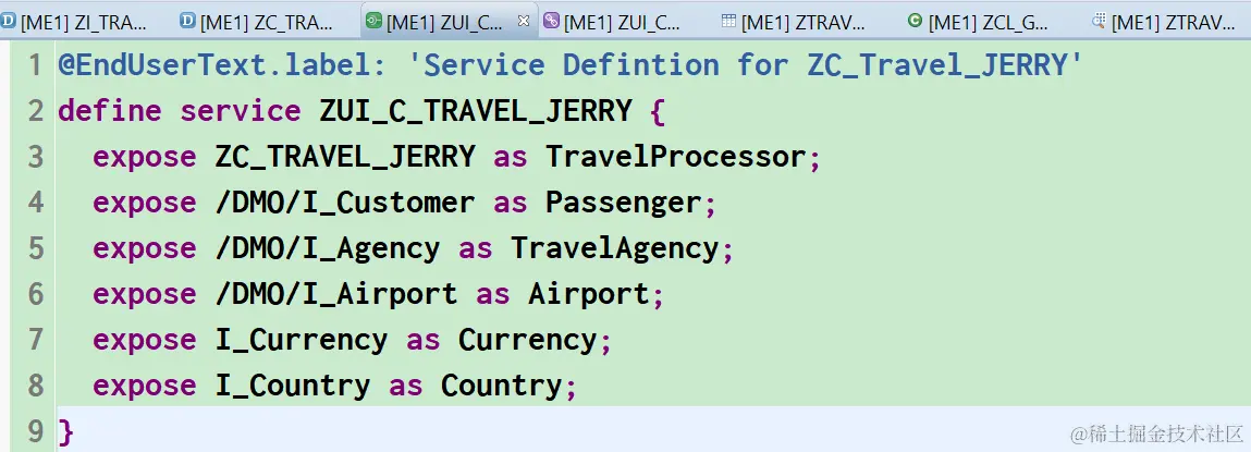 这个服务定义的第一条记录,就是通过ABAP expose关键字把projection view ZC_TRAVEL_JERRY暴露出来,模型名称为TravelProcessor: