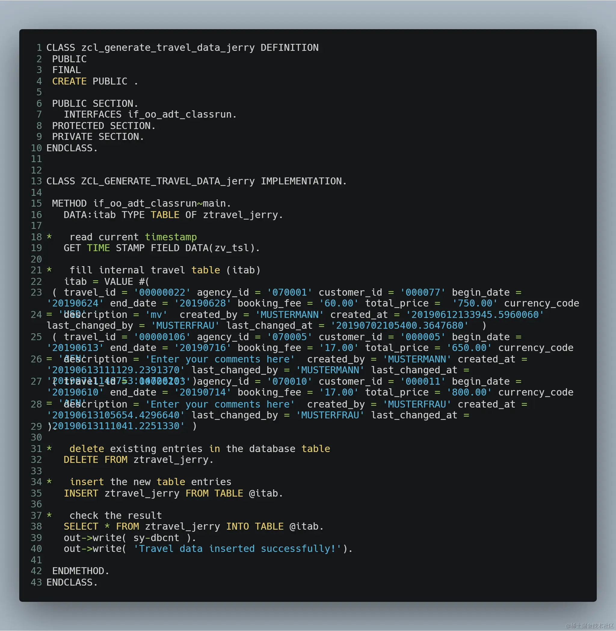 因为我们在ABAP Development Tools里无法用事务码SE16手动往这张表里插入数据,所以我创建一个ABAP类,用ABAP代码往这个表里插入三条数据。