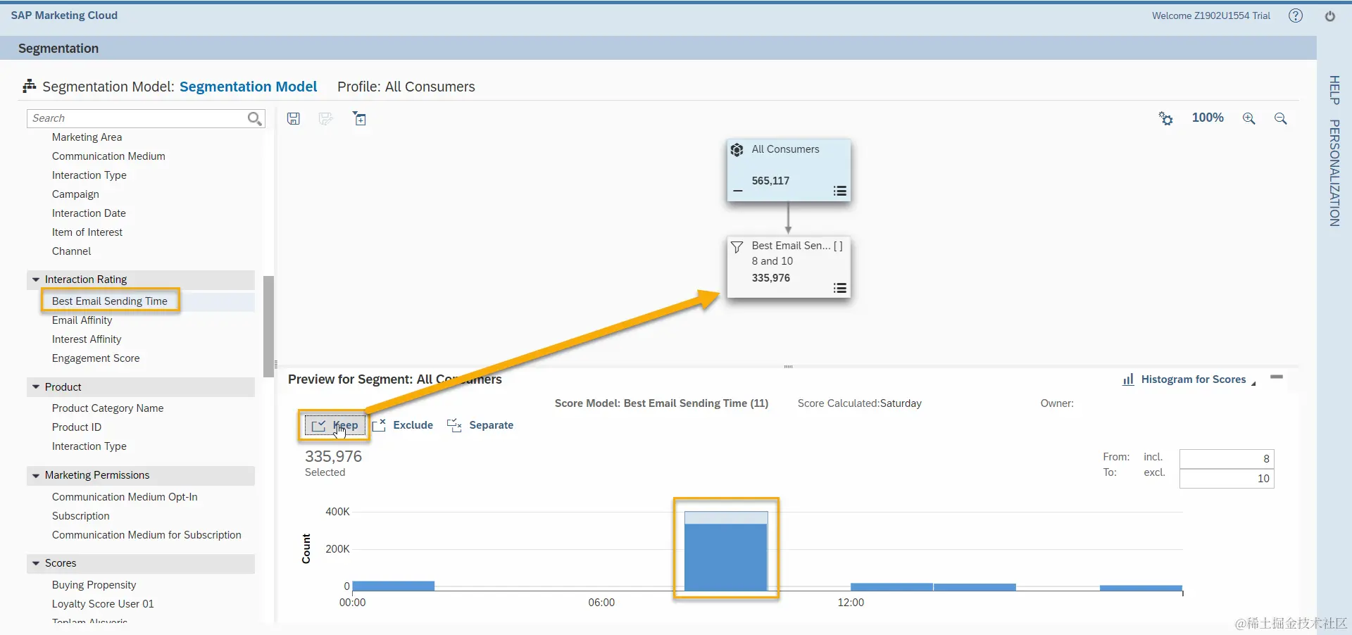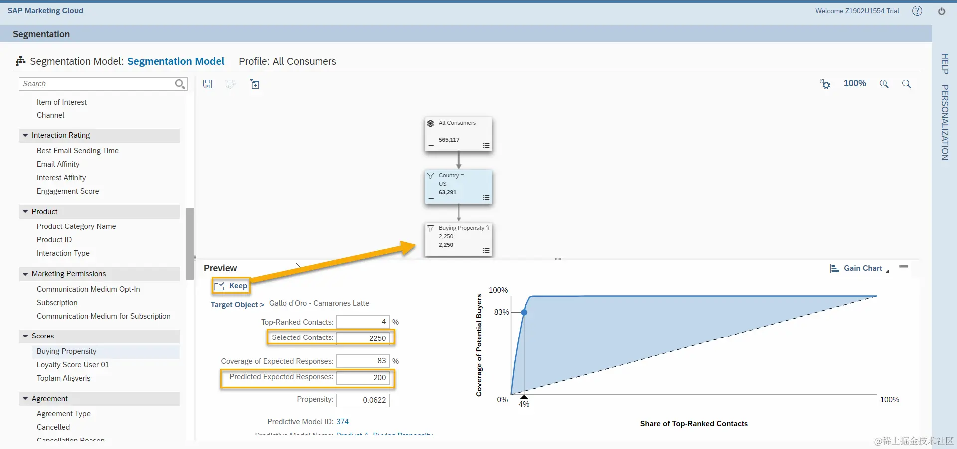 选择Buying Propensity,找到我们提前设置好的模型,在Predicted Expected Responses一栏填入我们期望的订单数200, Selected Contacts会显示目标组大小。选择Keep,确定Selected Contacts为目标组。
