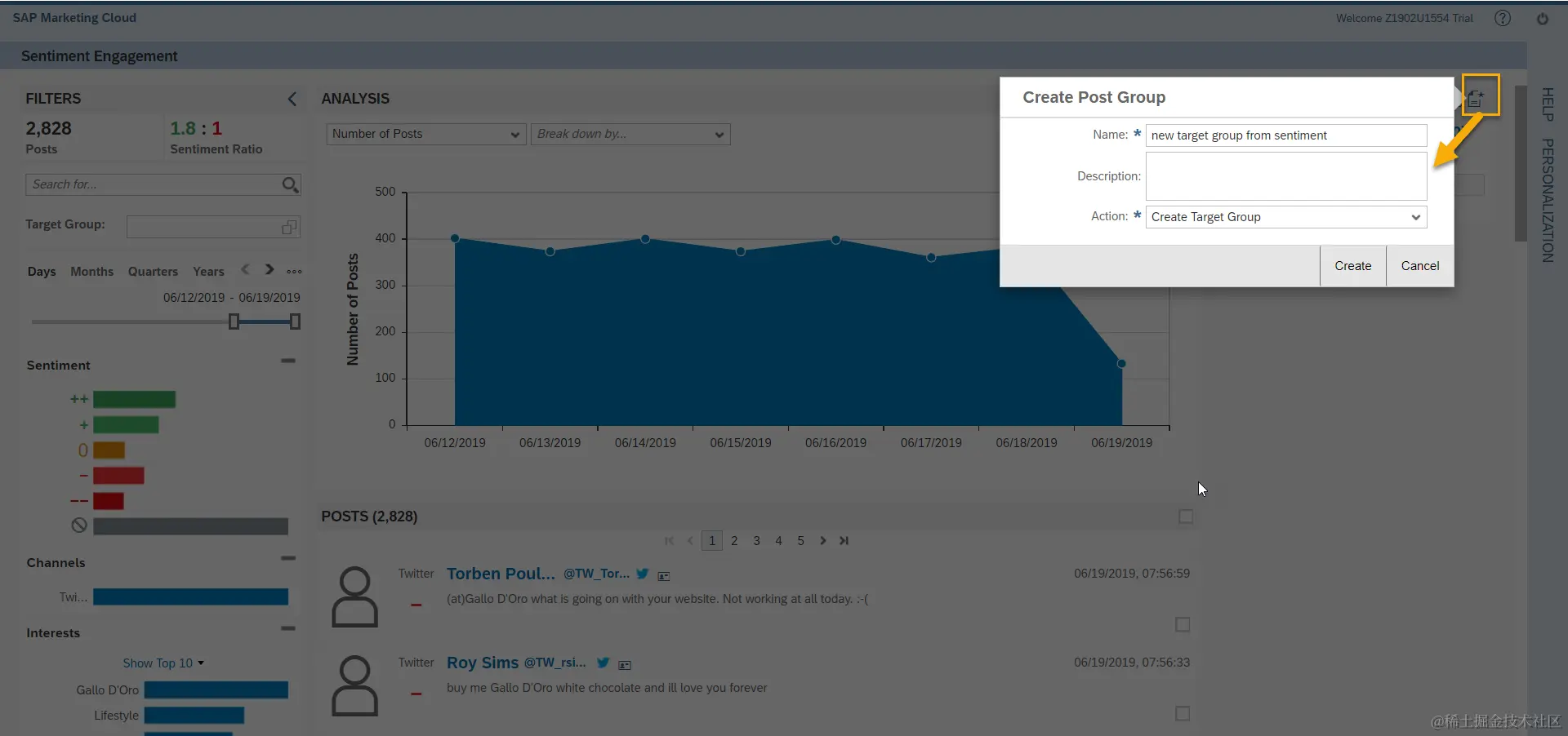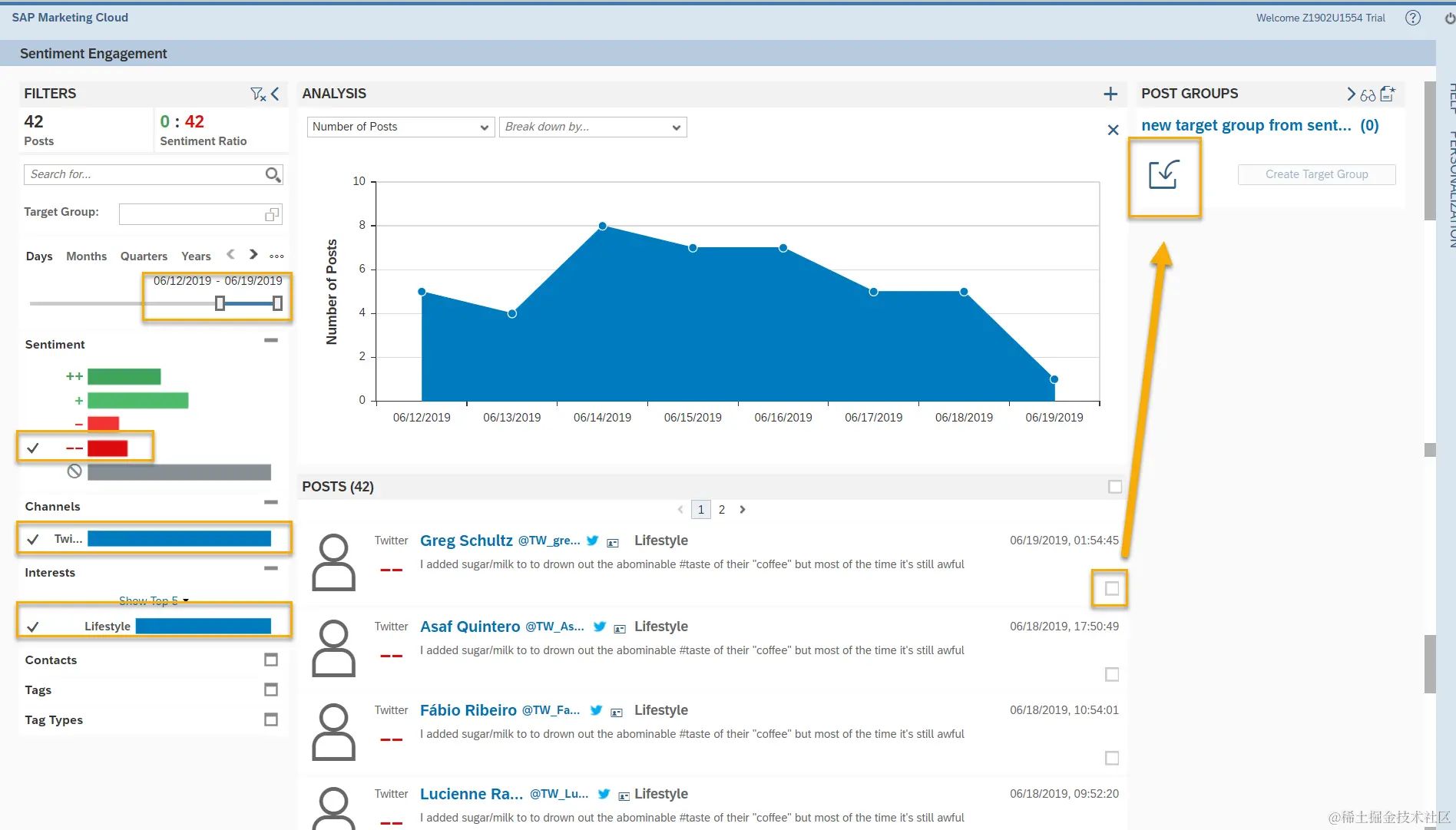 根据筛选条件显示符合条件的情绪互动,我们可以在用户的Post处进行勾选,导入之前创建的Target Group.