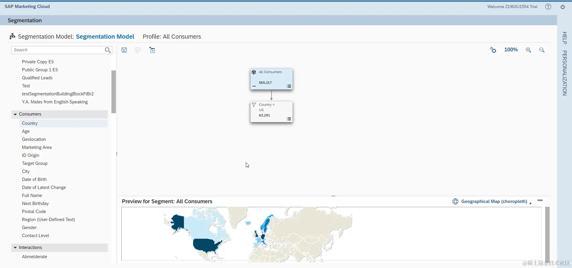 可以根据图形化界面双击某个国家对用户进行细分: