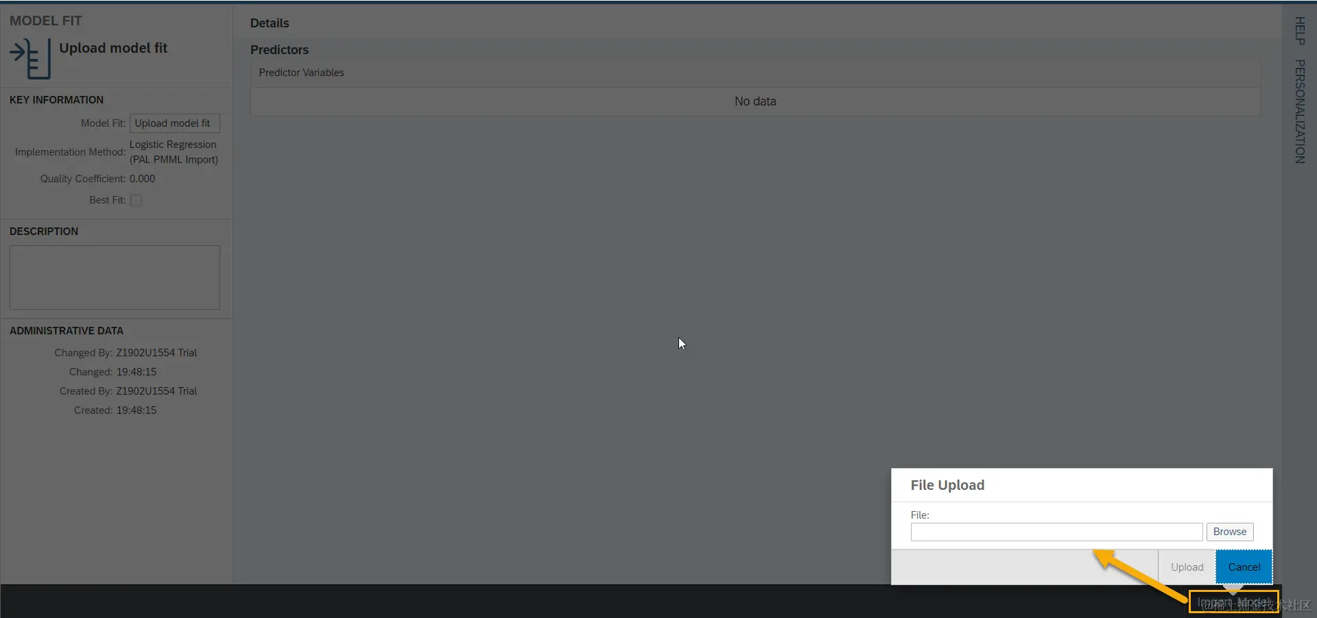 除了使用SAP提供的标准预测分析模型,我们还可以上载外部训练模型拟合。需要在创建新模型拟合时,选择Logistic Regression.