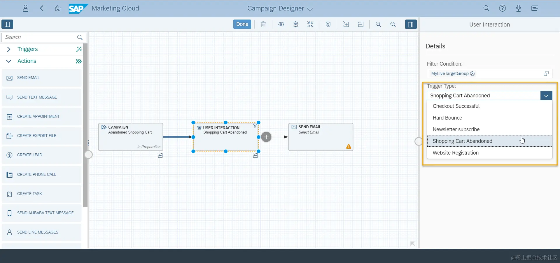 这类自动触发的营销活动,在创建Campaign时需要在User Interaction中设定Trigger Type,也就是设定触发营销活动的用户行为。这样当用户做出这些操作时,系统就会自动做出反应。例如当用户废弃购物车时,向用户发送邮件,提醒用户购物车中的商品,能够在一定程度上提高网上商城的盈利。