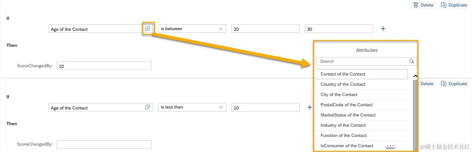 点击加号,创建Rule Model, 一个Score可以有多个Rule Model, 后者支持多种不同Rule的组合设定。Rule为if then形式,不同规则用"and"或者"or"连接。相比单纯在Segmentation Modeling中用标签来细分受众,Rule Model提供了多种属性按不同权重来综合衡量的可能。