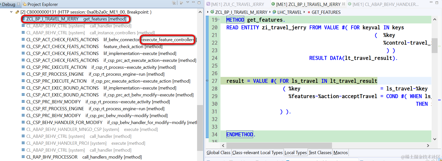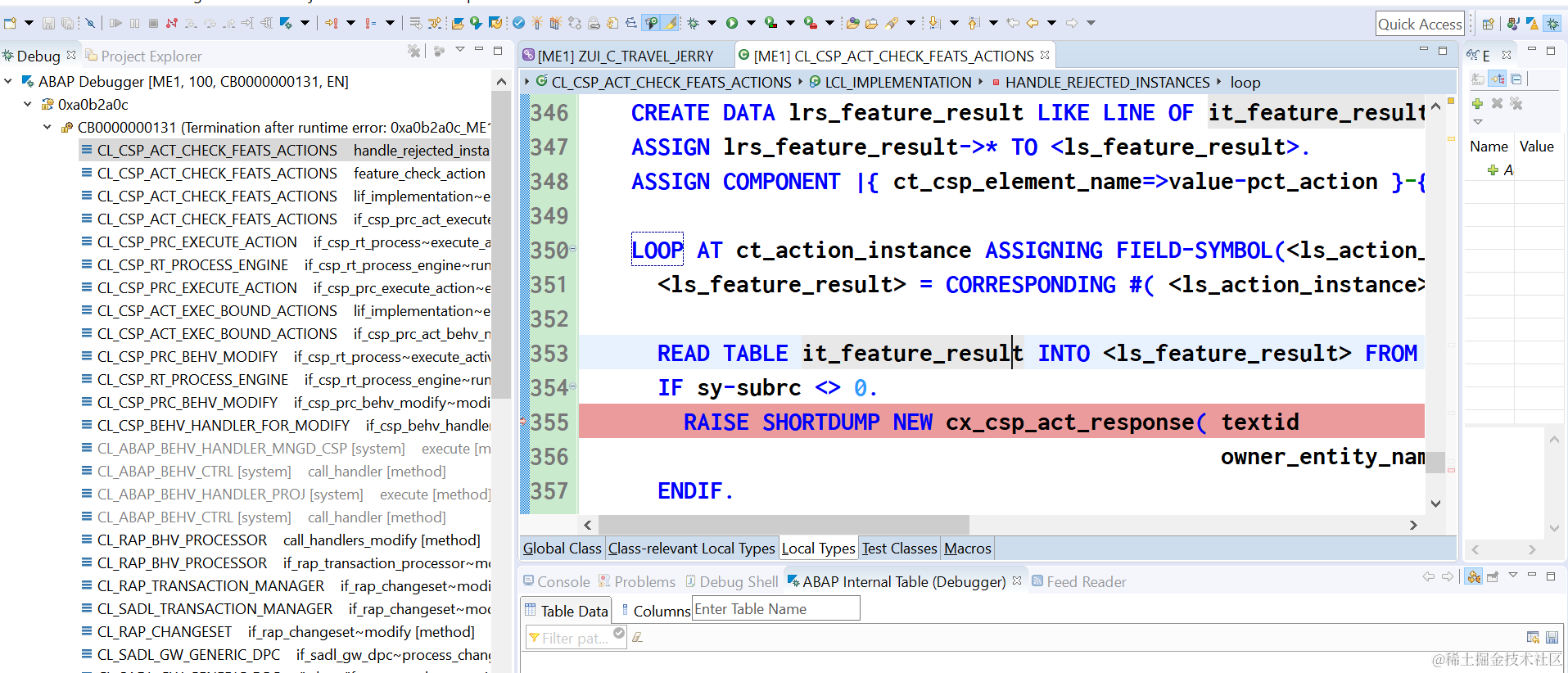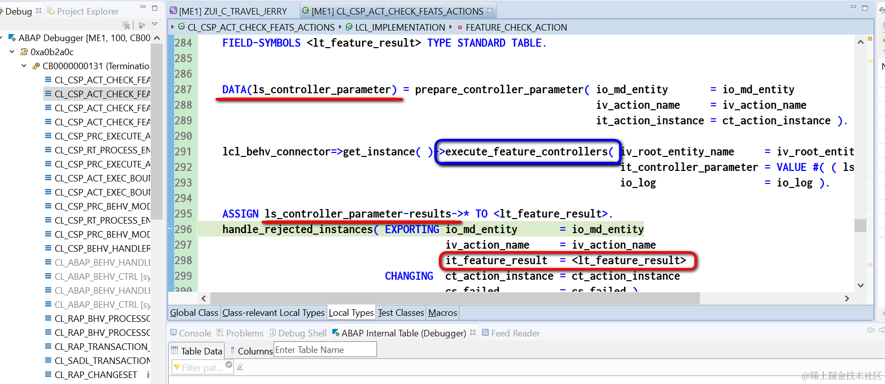 把鼠标放在it_feature_result上,发现这个内表是空的,当然无法从里面读出数据了。这个内表是当前ABAP类CL_CSP_ACT_CHECK_FEATS_ACTIONS的方法handle_rejected_instances的输入参数,需要搞清楚为啥这个输入参数为空。