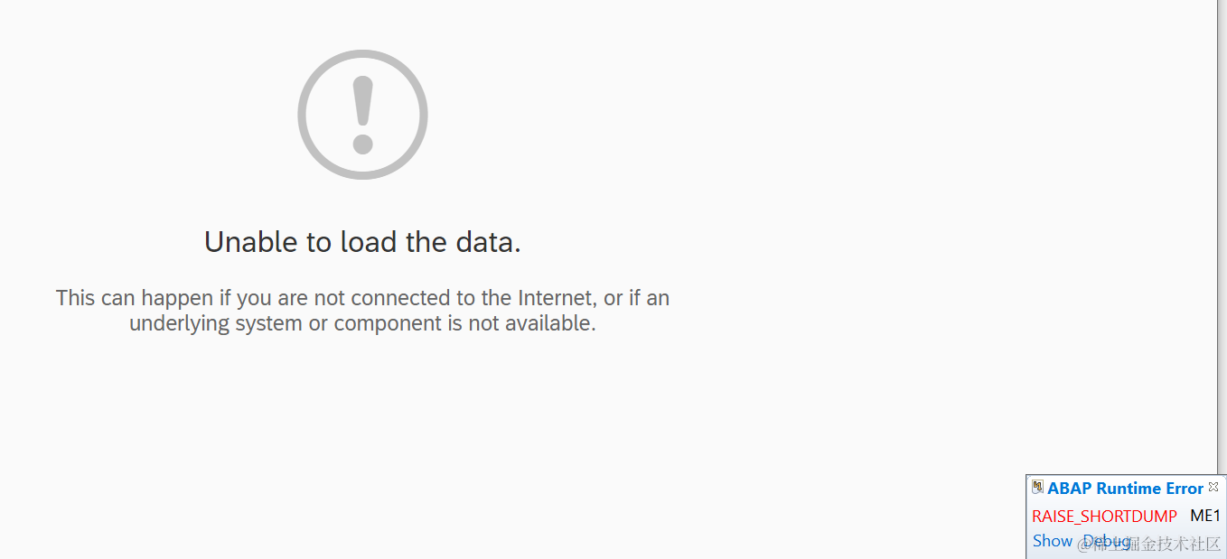 不幸的是,我没能看到期望中的状态变化,而是下面这个所有ABAP编程人员都不愿意看见的ABAP运行时错误提示界面。
